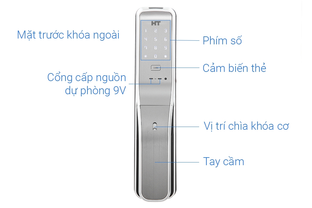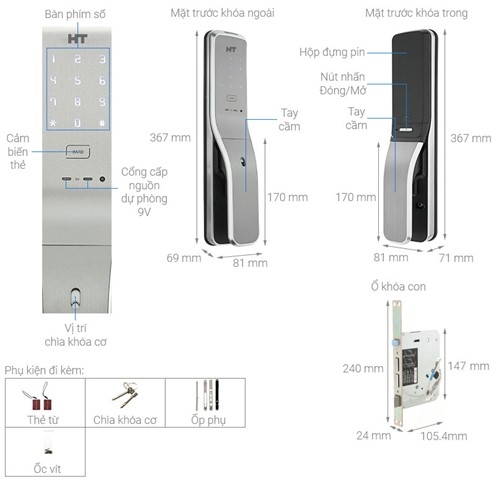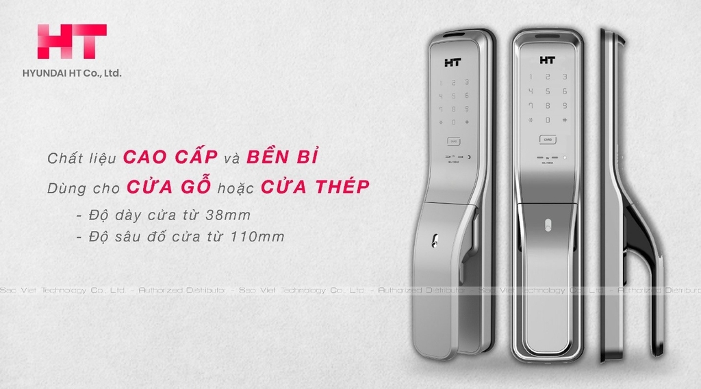 Khoá điện tử Hyundai HT với đa dạng cách mở khoá tiện lợi bao gồm: Mã số, Thẻ từ RF, Chìa khoá, App HT Home. Chất liệu CAO CẤP và BỀN BỈ dùng cho cửa GỔ và cửa THÉP