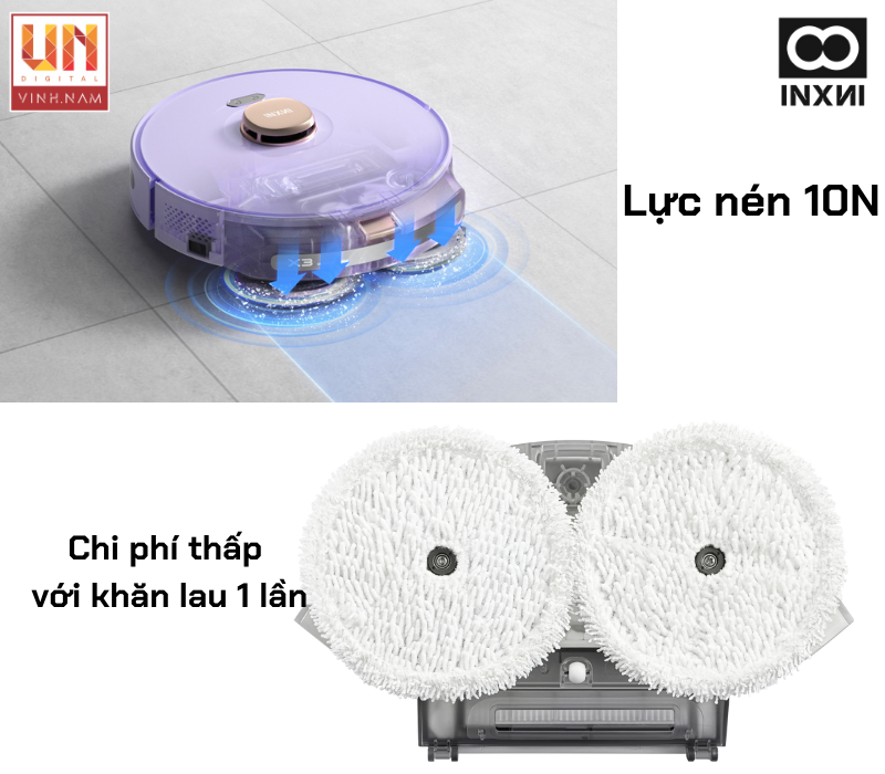 INXNI X3 là sản phẩm đầu tiên trong phân khúc phổ thông trang bị công nghệ lau xoay 360 độ mô phỏng cách lau của con người, giúp dễ dàng làm sạch mọi vết bẩn với lực áp sát mặt sàn 10N kết hợp với 150 vòng xoay/phút với bộ đôi khăn lau. Công nghệ này thường được áp dụng trong các sản phẩm cao cấp với mức giá từ 15 triệu tới 20 triệu.